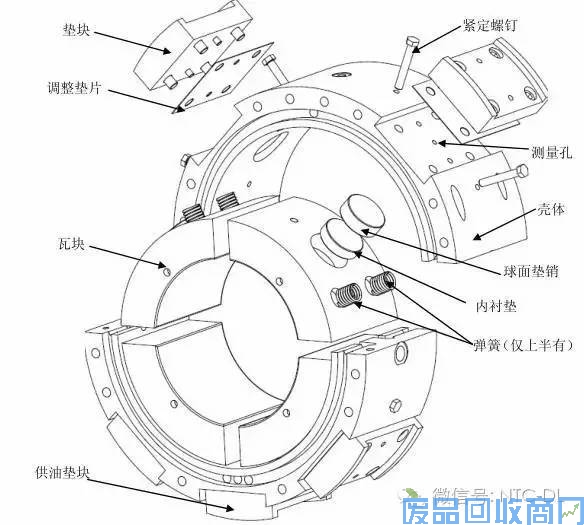 在工业汽轮机上常用的径向轴承有圆瓦轴承、椭圆瓦轴承、多油楔固定轴承和可倾瓦轴承,并且以可倾瓦轴承使用最多。可倾瓦轴承与上述轴承相比其优点是每一块瓦均能自由摆动,在任何情况下都能形成最佳油楔,高速稳定性好,不易发生油膜振荡,应用广泛。