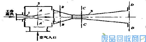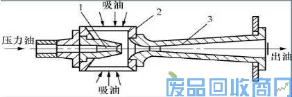 注油器又称射油器,它实质上是一个射流泵;对于大型机组的供油系统,通常装有两个注油器,可并联或串联。以下是其工作原理图,注:1——喷嘴;2——混合室;3——扩压管