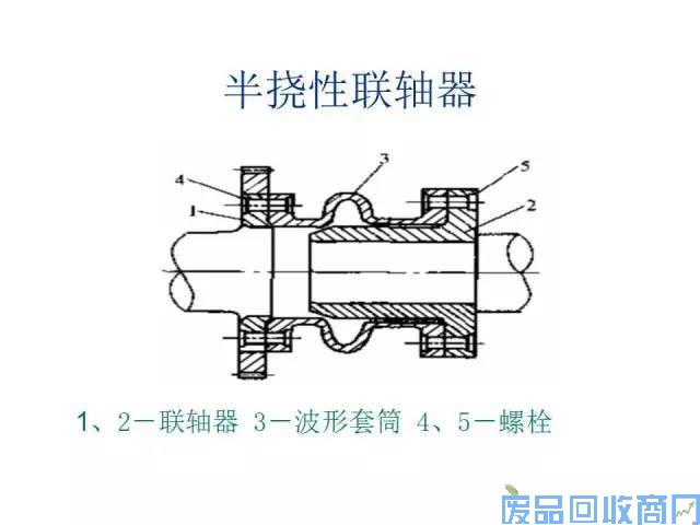 2) 半挠性联轴器:两半联轴器之间加了一段波形圆筒。他在传递扭矩时是呈刚性的,还能传递一定轴向推力,部分吸收转子之间传递的振动。它也允许相邻两轴端之间有少许的不同心度和端面瓢偏度。