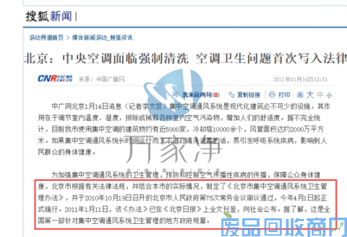 正因如此,北京市卫生局出台了《公共场所集中空调通风系统卫生管理规范》,强制所有使用中央空调的单位对空调通风系统进行一次大扫除,检查不合格的中央空调将强制清洗,拒不执行的拟处最高5万元的罚款。此项规定首次被写入法律。