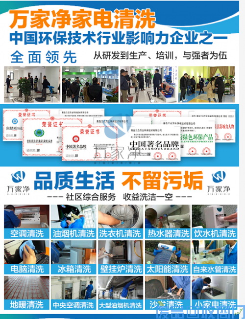 据记者采访了解,万家净在中央空调清洗技术和设备方面可以说是业内屈指可数的。自公司2003年成立以来,三众万生密切关注国际上先进的清洗技术,多年来技术革新的同时,更引进大批高端的清洗设备,在圈内获得响亮的名誉,并陆续评为全国产品质量公正十佳品牌、质量服务诚信AAA企业、中国环保技术行业连锁首先品牌、中国环保技术行业最具影响力品牌、中国优秀绿色环保产品,以及中国著名品牌。