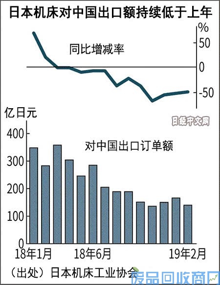 此外,日本机床对美国出口在1月时隔2年低于上年,2月也减少21.1%,明显放缓。对欧洲出口也减少18.2%,连续4个月减少。内需减少28.4%,降至416亿日元,连续3个月低于上年。