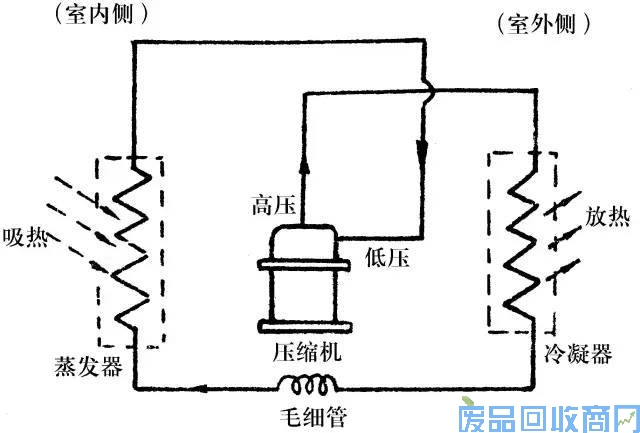 制冷剂经节流降压后,在室内侧的蒸发器中等压蒸发,吸收潜热,变成低温低压的蒸气,然后经过压缩机压缩,变成高温高压的蒸气,最后在室外侧的冷凝器中冷凝成液体,放出潜热。如此周而复始,不断循环。小型空调器节流装置为毛细管,大、中型空调器节流装置为膨胀阀。