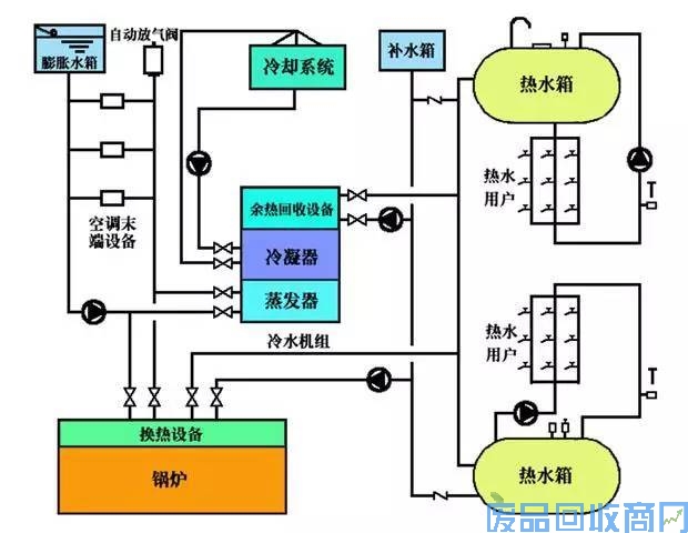 制冷主机、冷冻水泵、补给水泵、电子水处理仪或全自动软化水处理装置、水过滤器、膨胀水箱、末端设备。
