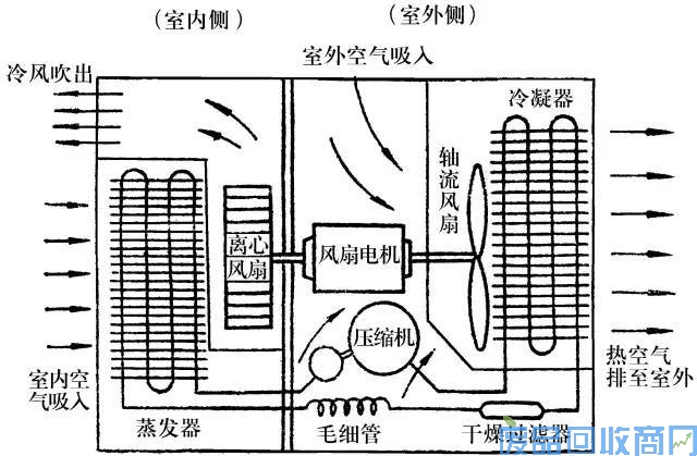 空调器要不断把房间内的多余热量转移到室外,使室内温度保持在一个较低的范围内。它包括两个循环——制冷循环和空气循环。