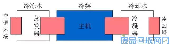 制冷主机、冷却塔、冷冻水泵、冷却水泵、补给水泵、电子水处理仪或全自动软化水处理装置、水过滤器、膨胀水箱、末端设备。